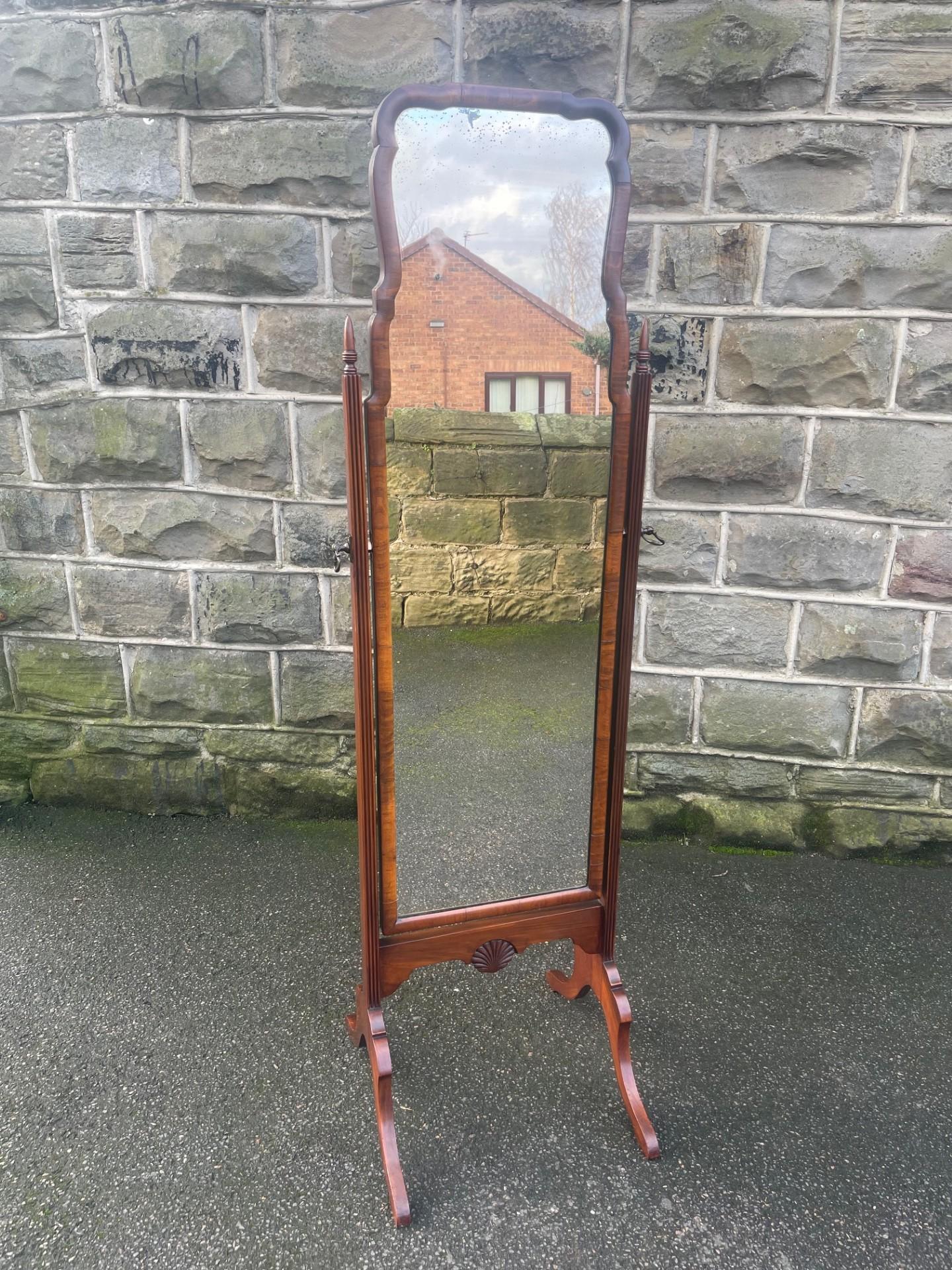 Offered for sale is this nice quality antique cheval dressing mirror. Walnut frame with arched queen anne style top, walnut uprights with turned finials, brass screw in handles to support the mirror. Standing on shaped walnut legs with a central shell carved stretcher. The angle of the mirror can be adjusted by pushing backwards or pulling forwards.