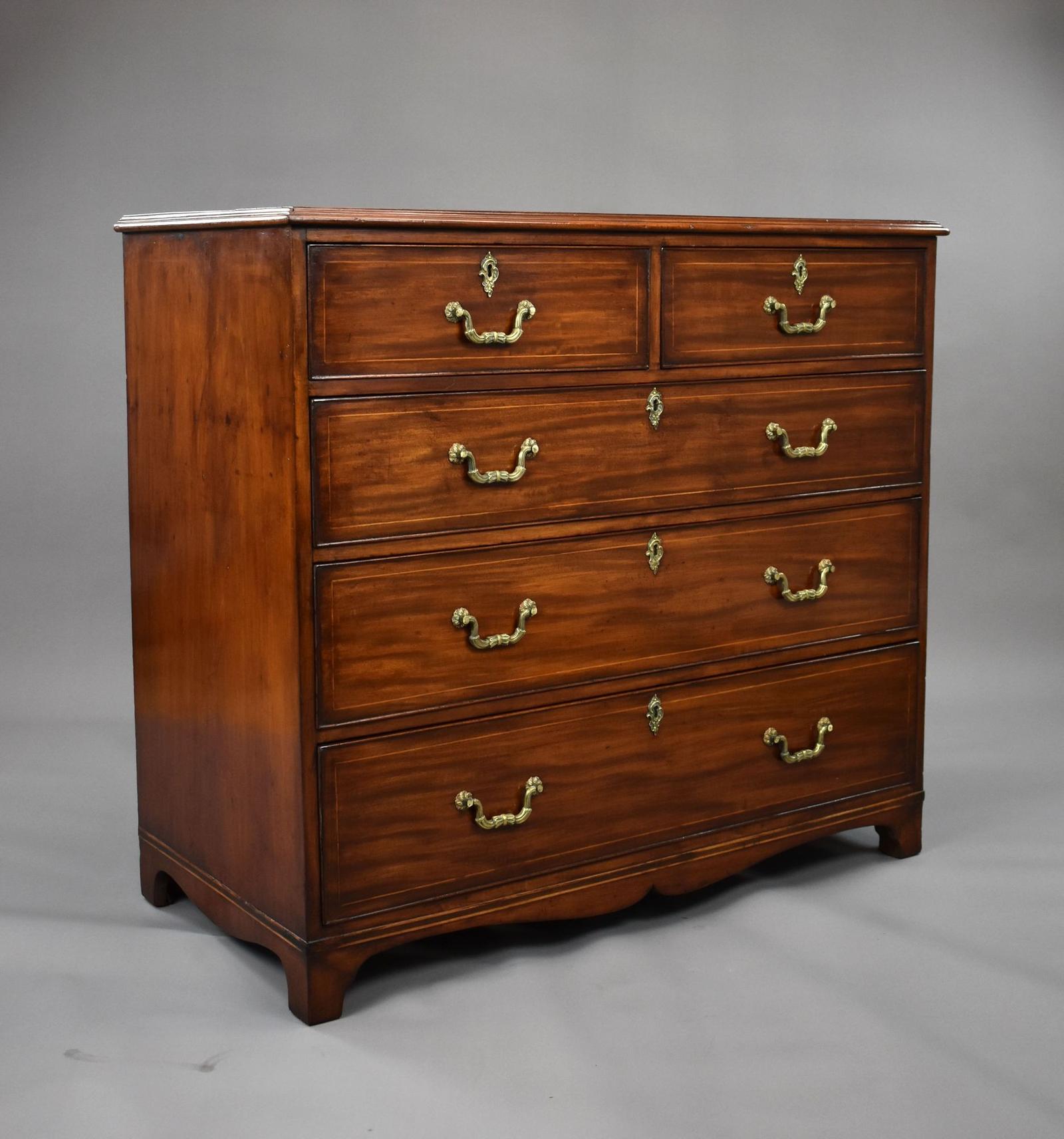 The piece stands on a shaped plinth base and features a neatly moulded top with fine line inlay around the edge, adding subtle decorative interest. The sides are plain and well-finished, and the drawers run smoothly, offering generous storage. A practical and attractive chest, well suited to both traditional and contemporary interiors.
