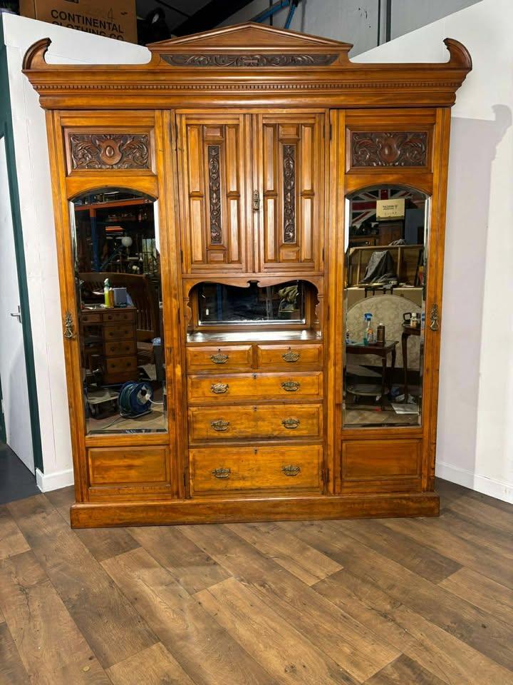 The wardrobe is crowned with an ornate carved pediment and decorative frieze running the full width, setting off the finely panelled and carved façade below. The front is arranged with two large mirrored doors flanking a central cupboard section, providing both visual balance and practicality.