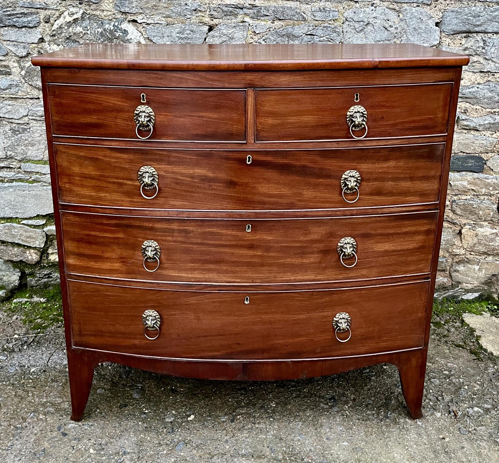 A lovely mahogany chest of drawers dating from the early 19th Century. They are a good large size with an attractive bow front and they stand on bracket feet. The oak lined drawers have brass lions head handles. It is in very good condition for its age with a nice colour and patina. The drawers open smoothly and are generally clean and tidy inside. There are some signs of age and use, some minor old marks and knocks and a couple of small repairs but nothing untoward or detrimental. It has been cleaned and gently polished and is ready for use. The best description comes from the photos so please look at them all carefully and if you have any questions just ask. Nationwide delivery available through our network of reliable couriers. Please get in touch for an accurate quote to your location.